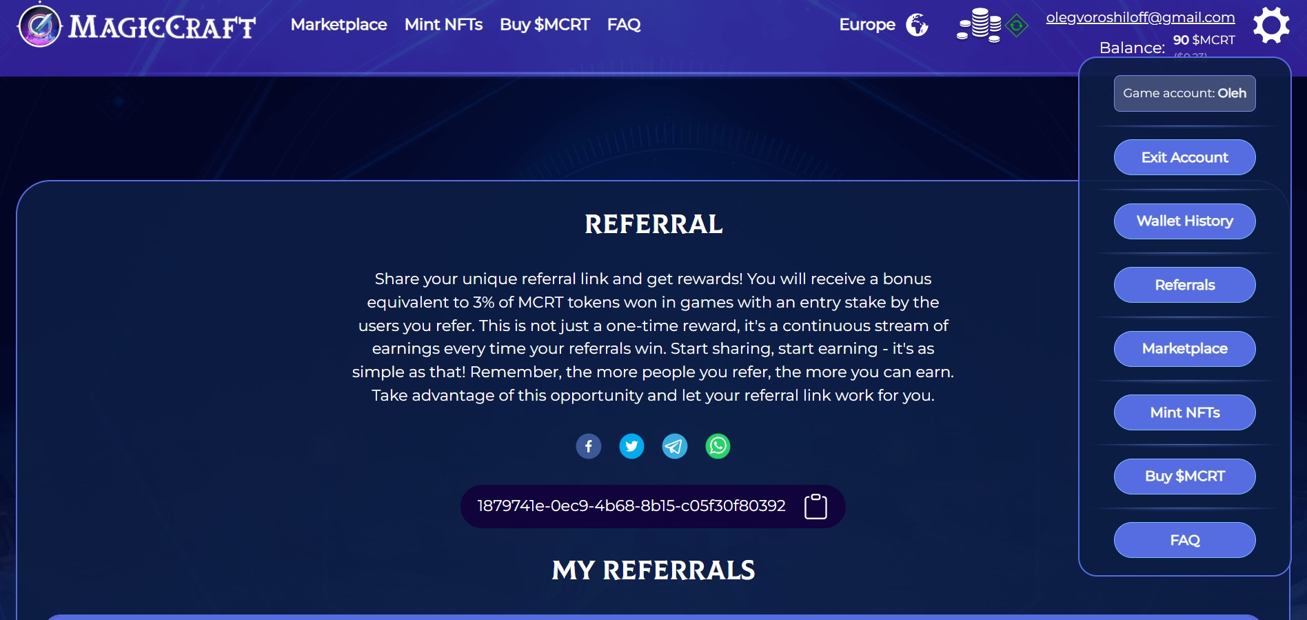 * **Share the Link:** Share the referral link with potential players. When they use this link to join MagicCraft, they become your referrals.&#x20;